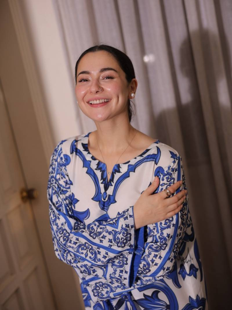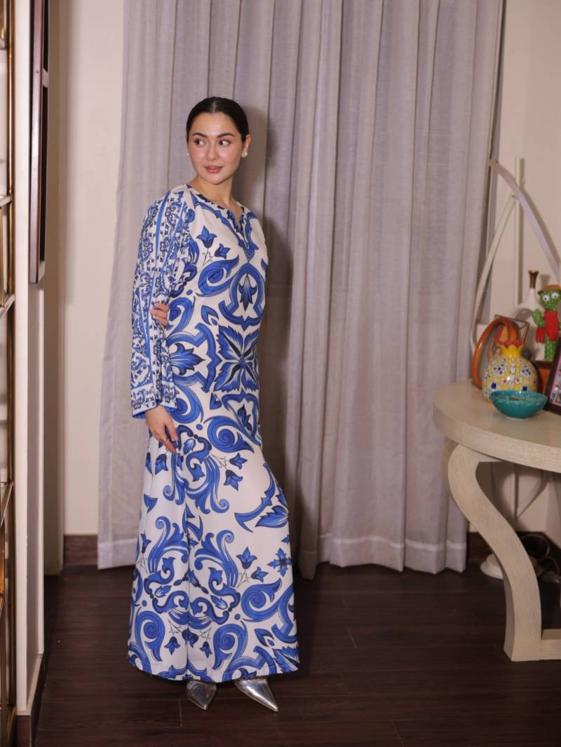 Hania Aamir recently captured the attention of fans across social media with a stunning display of winter fashion. Sharing a fresh set of photos on her Instagram, the actor donned a blue and white winter-printed kaftan, combining comfort and elegance effortlessly.