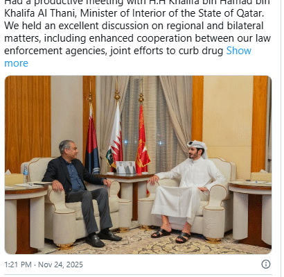 Interior Minister Mohsin Naqvi held an extensive meeting with Qatar’s Minister of Interior and Commander of the Internal Security Force, HE Sheikh Khalifa bin Hamad bin Khalifa Al Thani, during his official visit to Doha. The discussion marked a significant step forward in Pakistan–Qatar relations, particularly in the areas of security coordination and regional stability.